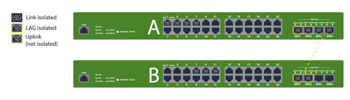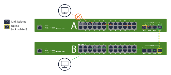 When VLANs span multiple access switches, isolation still blocks peer L2 communication per switch. Keep the access ports isolated and carry the VLANs upstream via non-isolated trunks. The “A/B switch” examples visualize this exact design—clients on A and B can reach upstream, but not each other at L2. If you need inter-device communication, don’t use isolation for those specific ports, or move them to a separate non-isolated role.